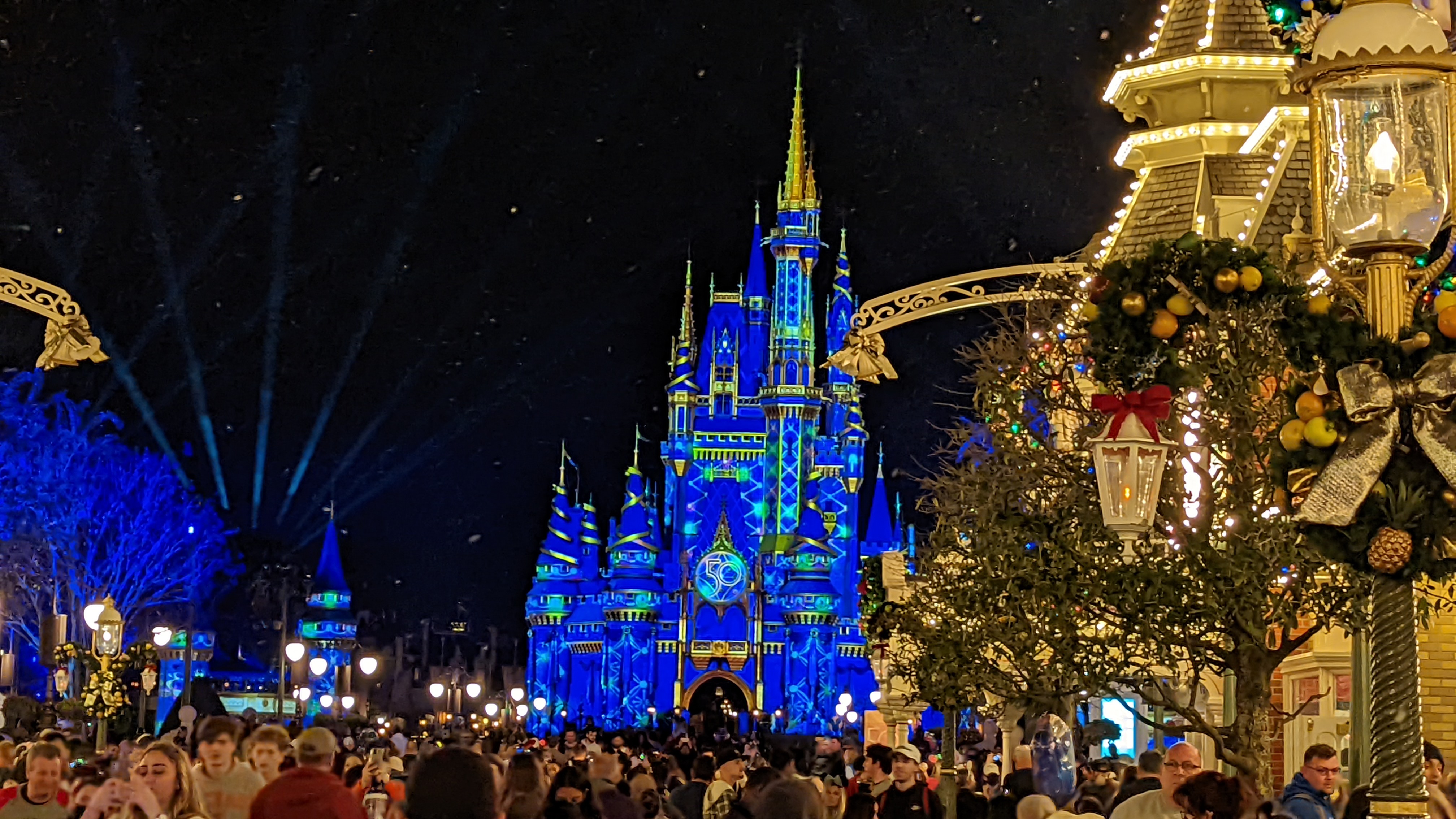 And the castle was lit up in all its 50th anniversary glory. Such a beautiful sight! The snoap was falling on Main Street. Large crowds were filling the street, but it was only 6:30 and we had a Lightning Lane for Peter Pan to get to.
