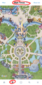 The icon next to home is the Map icon. The map allows you to see locations of all sorts of items. The default view is wait times/ride locations, but if you click Wait Times, you’ll see this menu: