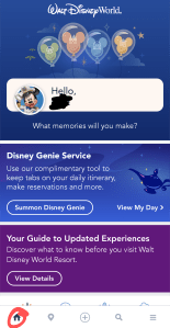 When you open the app, you’ll see the main screen welcoming you to the app. This page has a few helpful sections, like quick access to Genie, park hours for the day, and, when necessary, a link to the Virtual Queue. To get back to this main screen, click the Home icon at the bottom left of the app.