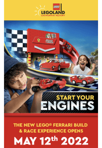 “The new LEGO Ferrari Build and Race is coming to LEGOLAND® California Resort on May 12th. Featuring a life-size LEGO Ferrari F40, Build and Race puts you in the driver’s seat as you make your way through the “garage” to the “racetrack” using your creativity and imagination to build, test and race your own LEGO Ferrari.
